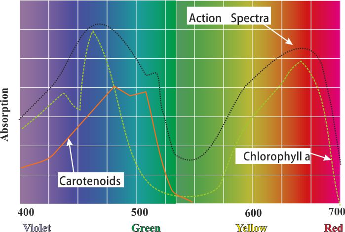 Notice the light produced with the green filter is only green. Remember that chlorophyll is green indicating that the green wavelength are reflected, not absorbed (notice the dips in the graph above in the wavelengths). Since green light is not absorbed, very little photosynthesis will occur. Since photosynthesis does not occur, no CO2 is taken up and very little change in pH will occur.